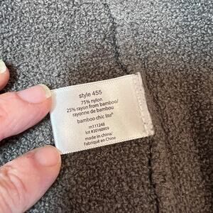 This super cozy weekend wrap in a bamboo blended fabric lays over the shoulders draped like a shawl.