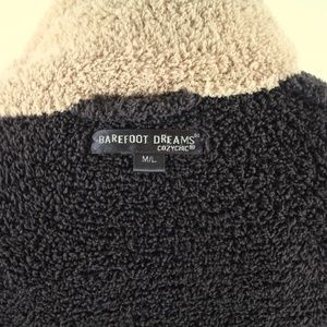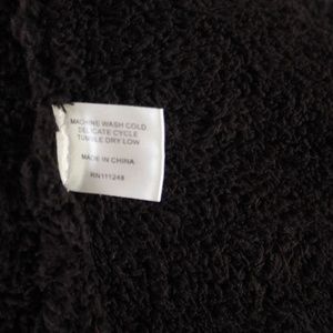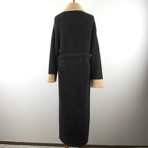 Luxurious robe with a soft texture. Features a black body with tan trim. Includes a matching belt and pockets.