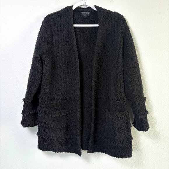 Barefoot Dreams CozyChic Boardwalk Cardigan Size L Black Fringe Open Front Knit