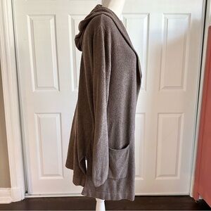 Super duper soft long gray tunic length cardigan from the CozyChic Line of Barefoot Dreams. It has a hood and huge pockets and super cozy. It has no stains or holes. The only sign of wear is that the fabric has started to get a little nubbly. But this brand is famous for staying super soft no matter how much you wash and wear it. It’s in great condition. 21” pit to pit, 33” length, 25” sleeves.