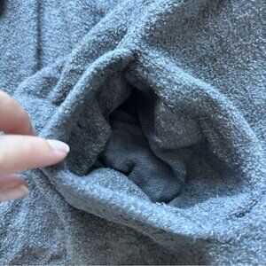 Details: Long sleeve, draped open front, side pockets, charcoal gray. Nylon, rayon blend. Style 903. Casual, lounge, soft, cozy.