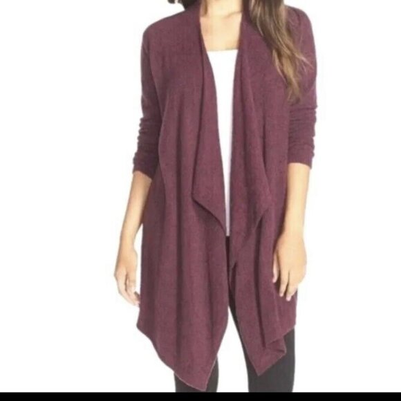 Barefoot Dreams CozyChic Lite cardigan in a rich plum color. Size L/XL. Super soft and lightweight with an open draped front and front pockets. Perfect for layering or lounging.