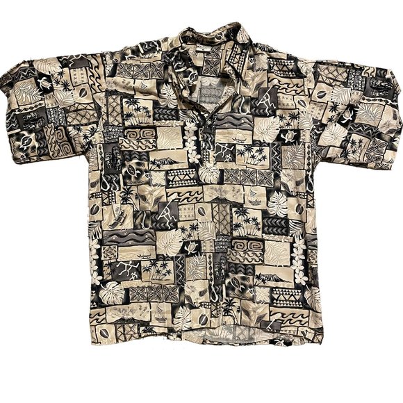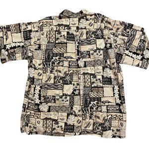 This Barefoot in Paradise men's Hawaiian shirt in size XL features a stylish blue and tan tapa print. Made from 100% cotton for ultimate comfort and breathability.