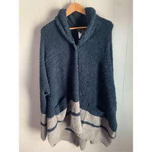 A single button closes this ultra cozy cape. This is a one size fits most with shawl collar and pocho sleeves, 2 front latch pockets, plush construction, color block asymmetrical hem