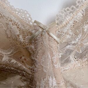 Elegant cream lace underwire bra with intricate floral patterns. Semi soft lined for modest coverage.