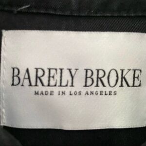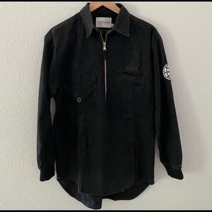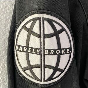 Black pullover shacket with gold toned hardware. Features two chest pockets, one with flap and button closure. It also has a connecting pocket across stomach. There is a Barely Broke globe patch on left arm and a B patch on upper back. Great condition.