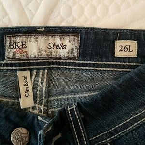 BKE Stella jeans. Barely worn. Inside hems snipped 1" to accommodate cowboy boots. Small purple stain on left waistband above pocket. Otherwise spotless!