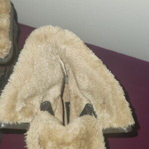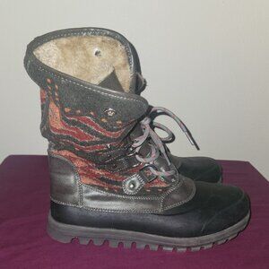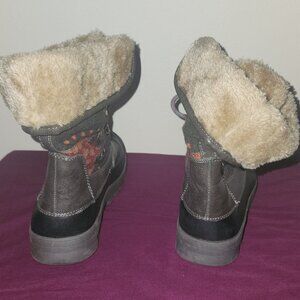 Black and brown womens snow boots with a "stay dry" system.