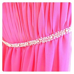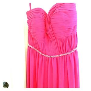 Beautiful Hot Pink Strapless gown with gorgeous beaded detail. It is fully lined. The empire waist is very flattering. This dress has been worn one time for a wedding. It is a size 10 however there were some alterations done. It will fit smaller than a size 10.