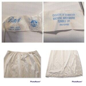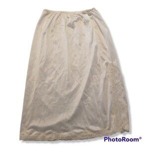 Women's, Bari white nylon half slip, in size Medium. Vintage from the early 1980s. Has lace trim around the entire bottom hem, and up the front slit. Has small elastic waistband, Made in USA.
