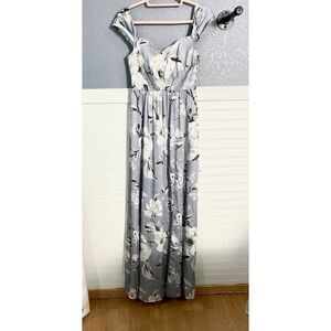 This Bariano dress features a gray color, a floral pattern, sweetheart neckline, off the shoulder fit, a leg slit and floor length.