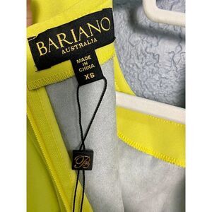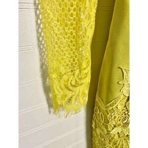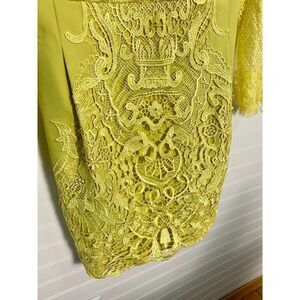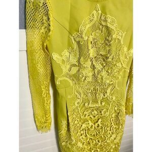 This Bariano dress features a yellow color, faux suede, lace detail, long sleeves, a pleated hem and a mini length.