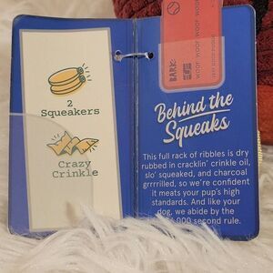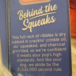 This full rack of ribbles is dry rubbed in cracklin’ crinkle oil, slo’ squeaked, and charcoal grrrrilled, so we’re confident it meats your pup’s high standards. And like your dog, we abide by the