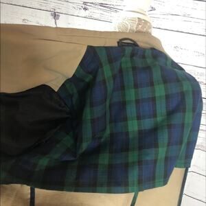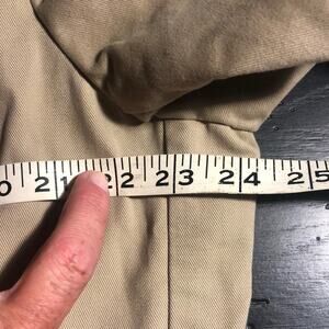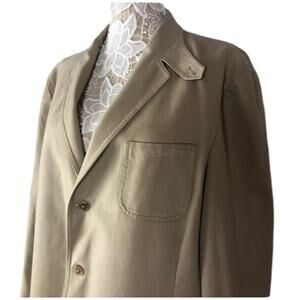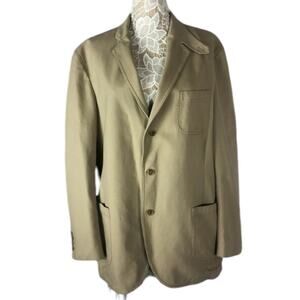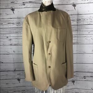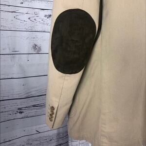 Khaki blazer with three button closing two pockets on outside and two on the inside. Patch elbow s in brown and stand collar in brown. Partly lined