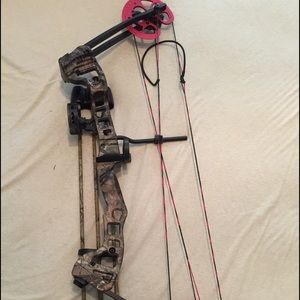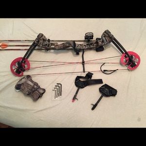 Brand new, never used compound bow. Pulls up to $65 pounds. Comes with accessories pictured. Bow retails for $200 by itself.