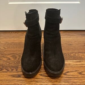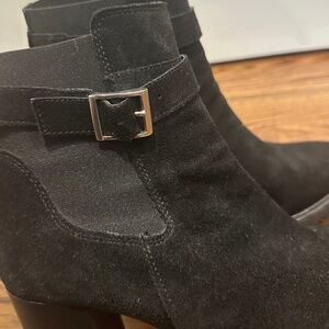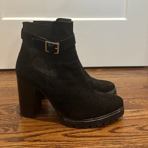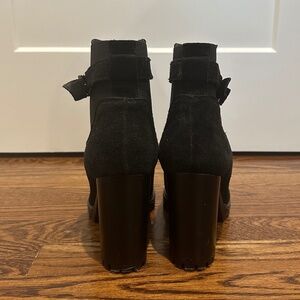Black suede heeled chelsea boots from Barney's New York. Removable ankle strap with silver buckle. Gently worn with signs at elastic and creasing at ankle.