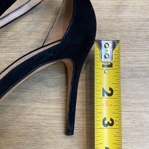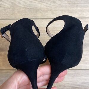 Chic and classic minimalist black suede sandal ankle strap heels by Barneys New York. The open toe strap features a polished black suede bow for a charming feminine touch. In excellent condition, worn once, Size 36 Barney's conversion to a US 6
