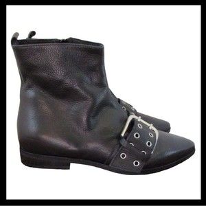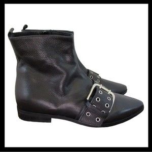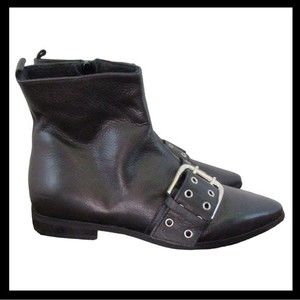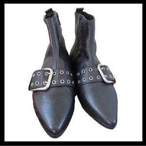 Barneys New York Black buckle strap leather ankle boots. Styled with a pointed toe and buckle strap at the vamp. Pointed toe. Shiny polished silvertone hardware. Pointed toe. Stacked heel. Black Leather and polished silvertone hardware.
