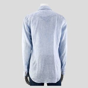 Barneys New York XO Bolzonella 1934's Slub Linen Western Shirt in light blue and white slub-weave linen and cutaway collar. Marbled cream and silvertone snap placket closure. Single-snap rounded barrel cuffs. Shirttail hem reinforced with side-seam gussets.