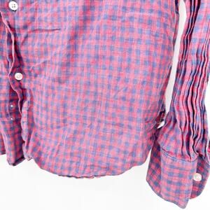 Barneys New York Mens Beachy Gingham Plaid 100% Linen Button Up Shirt in Pink and Blue. Size Small.