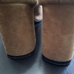 Stylish Tan suede slip-on mules with a 3" block heel. Perfect for casual wear.