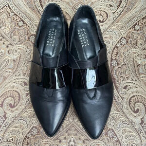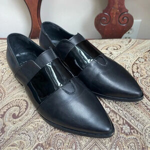Smooth slip on black leather point toe flats with elevated patent leather faux strap detail. Can easily be dressed up or down.