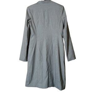 Barneys New York women's Medium long blazer jacket is made of 69% polyester, 16% wool, 14% rayon and 1% polyurethane. It has 100% polyester lining. It has shoulder pads, back slit, is double breasted, and has two faux front flap pockets.