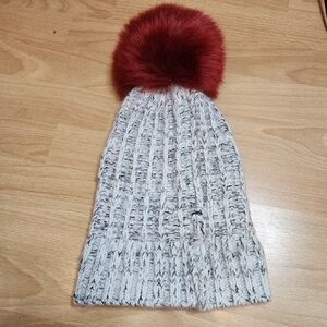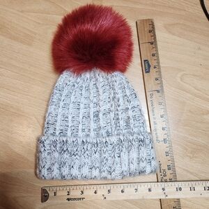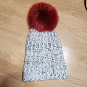 Barney's New York Wool Blend Grey Knit Beanie Faux Fur Large Red Pom Pom