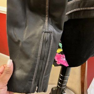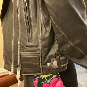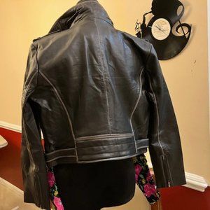 Barneys Original Petite Real Leather Women's Black Jacket Asymmetric Zip with Exposed Zipper Detail BroadShoulder with Lapels Half Zip Sleeves; Size US 6 Petite - fits like a Regular Women's Size 2