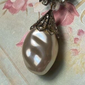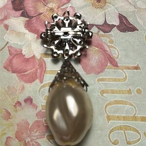 Huge faux Baroque pearl pendent hangs by a small hook. The Pearl can easily be removed & hung on a chain. I attached the pearl to the small rhinestone pin (7/8”). Both pieces are in good vintage condition. The faux pearl is pristine. Total brooch length is 2 1/4”.
