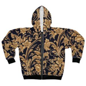 A zip-front hoodie that blends vintage elegance with everyday utility. The front panels showcase a deep navy background layered with warm, baroque-inspired gold florals and scrolling vines — a rich, tactile pattern that reads like an heirloom textile. Black sleeves, hood, and back create a bold contrast that keeps the ornate motif visually grounded. Wear it zipped up for a composed, tailored look or open for a relaxed layer over tees and button-ups. The roomy front pockets and medium-weight polyester body make it a dependable go-to for cool mornings, creative workdays, or evenings at a café. Thoughtful details — like black zipper hardware and white topstitching — give it a handcrafted, stitched-together feel that suits someone who appreciates style with substance.