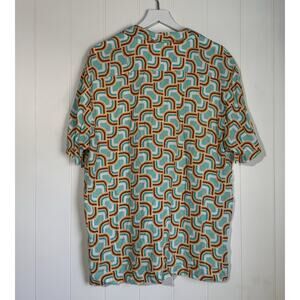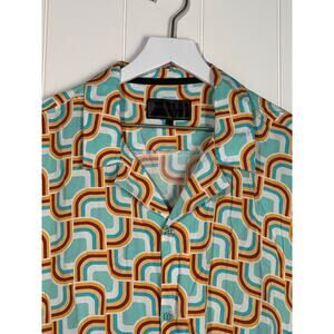 This men's short-sleeve shirt features a unique baroque design with a bold, gold pattern. The vivid color palette of teal, orange, and burgundy is complemented by matching teal buttons. It has a relaxed, button-up fit, making it a comfortable and stylish choice.