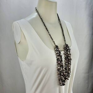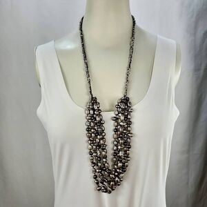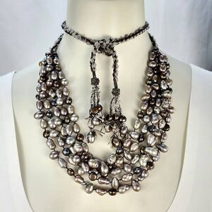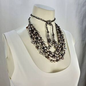 A unique handmade statement piece! Five strands of hand knotted, approx 7mm sized baroque pearls in shades ranging from light grey to brownish purple. Strands are attached to fabric twine & ends are finished with pearls, fringe, & metal beads. Necklace can be worn multiple ways due to its long length (approx 42" long end-to-end). In very good condition with no flaws detected.