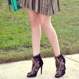 From the opulence trend to more is more! These gold studded pattern over black overlay lace bootie is a shoe that will for sure make a statement. Features open toe and gold zipper closure at the back, great for all year wear! Only worn once!