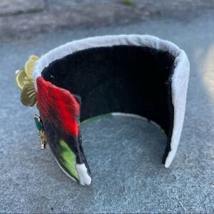 Dramatic chunky, over sized wrist cuff. Covered in a rich fabric and covered with chunky diamonds, vintage style costume floral jewels, rhinestones. Best thing is it is adjustable for comfortable fit for most wrists! Statement piece!