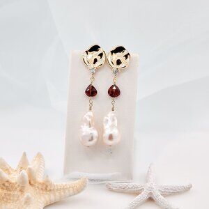 Baroque Pearl & Garnet Earrings, 14K Gold Filled CZ Hammered Studs