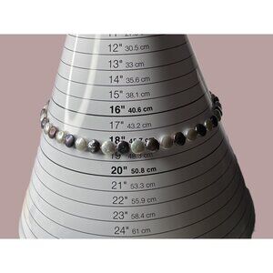 This 18" necklace features baroque pearls with a blend of purple and white iridescence, complemented by a sterling silver clasp for secure wear.