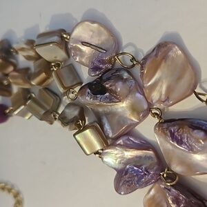 Baroque Pearl, Shell & Wooden Beads on a Goldtone Strand 17" Necklace. The Pearls have a very slight purple cast to them, along with the iridescent sheen of the shells and the purplish wooden beads, this is a stunning necklace.