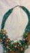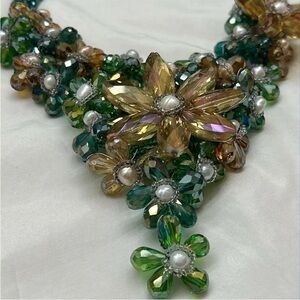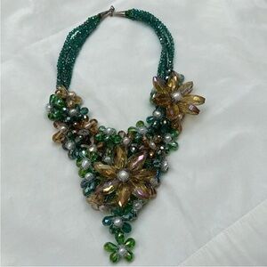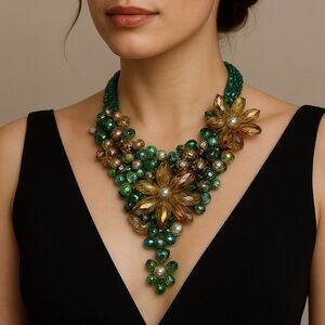 make and entrances and statement with this stunning necklace features a vibrant floral design with green and gold beads, Adored with Baroque Pearls, perfect for adding a touch of elegance to any outfit.