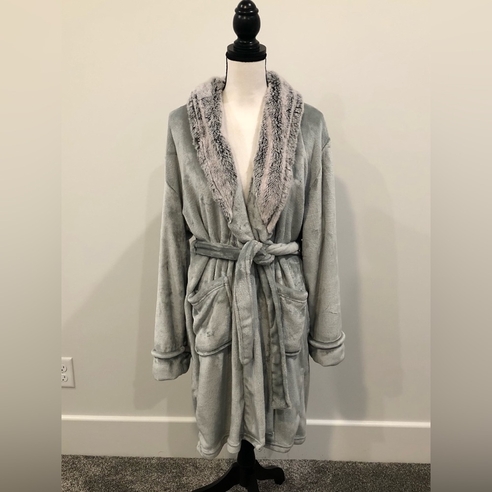 Baroque robe. Mint green with a grey collar. Ties inside and out. Extremely soft! Front pockets. Does have a small snag/hole in the upper left chest. One size fits most.