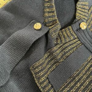 Barra of Italy navy blue military style, button Cardigan with Shoulder epaulettes, gold, metallic, threading, and gold buttons with a star in the center. On seam hip pockets. And 89% wool and 11% other fibers which I believe is the metallic threading. No size however it is featured on my size medium dress form for scale where it fits well without pulling too much in the bust area. Could also fit a large or maybe even an XL if you wear open, but double check measurements to ensure the proper fit for you, 29 inches shoulder to ham and 23 inches armpit to armpit.