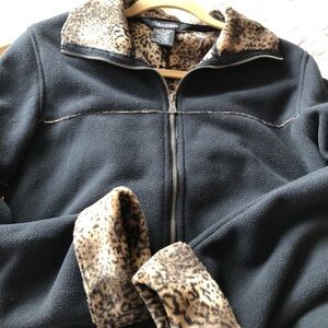 Phil Hobar design black outer and animal print full zip jacket. Two open pockets. Soft and cozy.