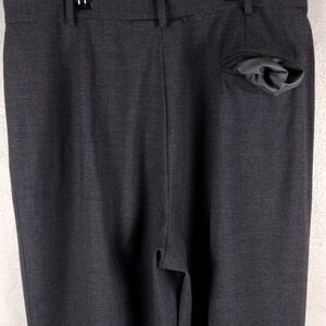 Barry Bricken Vintage Women's Plus Dark Grey Wool Blend Pleated Front One Button Two Hook Zipper Front Closure High Rise Straight Leg Trouser Pants. 98% Wool, 2% Lyrca. Two Upper Open Side Pockets. One Button Back Pocket. Belt Loops. Lines Pockets Only. Measurements approx. Flat Lay. Waist: 16, Rise: 13.5, Hips: 24, Inseam: 30, Leg Opening: 9". Size 14. Color May Vary Due To Lighting.