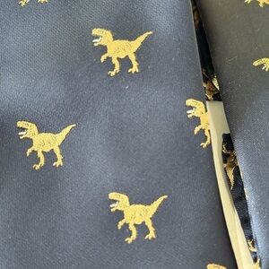 Barry Wang Men’s 60 x 3.5 in Men’s Tie Matching Pocket Square Navy Blue silk Italy. This is a very nice tie in perfect condition with Gold dinosaurs on the tie. Great for someone who loves dinosaurs. The matching pocket ties completes the line ok.