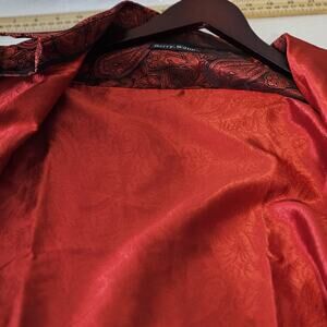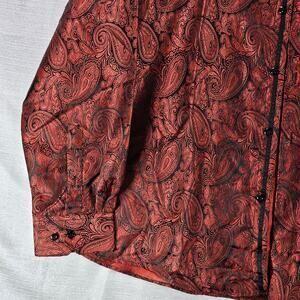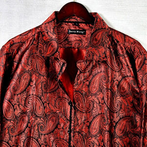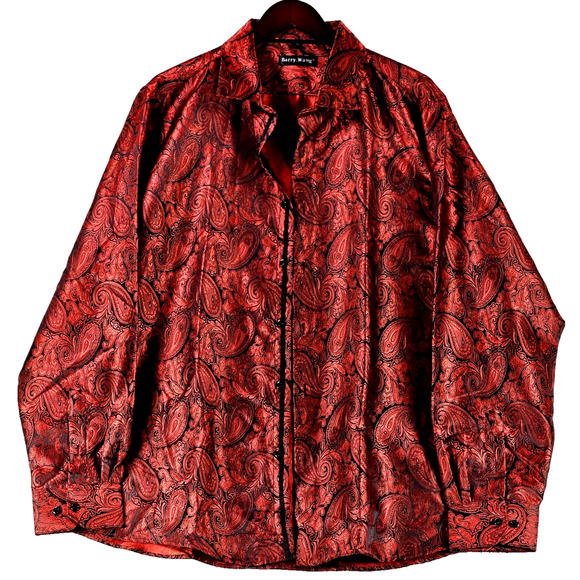 The Barry Wang Men's Silk Iridescent Paisley Button Up Shirt in size XL is a stylish and formal dress shirt suitable for weddings, parties, or any special occasion. The shirt features a collared neckline, long sleeves, and a button closure, making it a classic and versatile choice for men who want to make a statement with their outfit. Made from a blend of polyester and silk, this shirt offers a luxurious feel and a red color that adds a touch of sophistication to any ensemble. Perfect for those who appreciate fine craftsmanship and attention to detail.