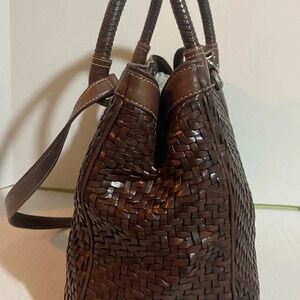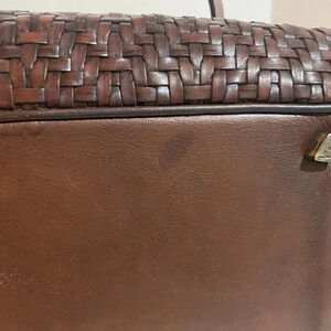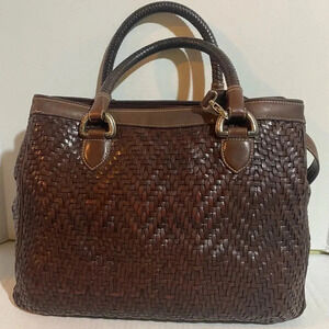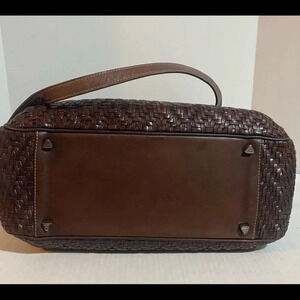 Barry kieselstein cord dark brown woven leather satchel handbag with sterling silver hardware main compartment 1 zip pocket closure at interior wall green suede lining lining have some stains inside zip pull tab is missing with sterling silver horse head ornament at front open top with braided handles exterior have some marks stains 4 sterling silver protective metal foot base hight 10.5” width 13.5” depth 5” Strap drop 5” shoulder strap 15” Bag dimensions are based on approximate measurements before placing an order please take a moment to view all photos using feature for a closer look