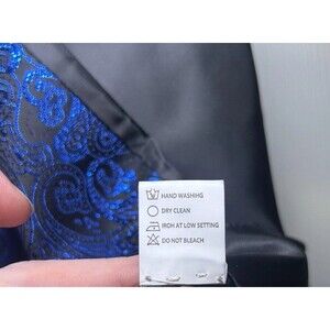 Color/Pattern: Blue and black paisley jacquard front with solid black satin back.