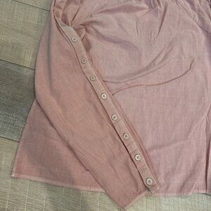 This blouse combines a relaxed fit with polished details, featuring button accents on the sleeves and a gentle dusty rose hue. It is versatile for casual to semi-formal wear.