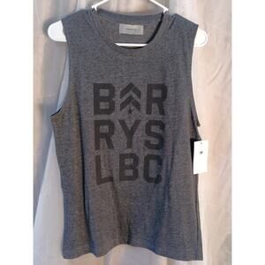 The product is a small Barry's brand dark grey muscle tank designed for women. It is a regular fit tank made of dark wash fabric suitable for activewear occasions. The tank comes in a stylish grey color that is perfect for a variety of athletic or casual outfits. Ideal for small-sized women looking for a comfortable and versatile activewear top.