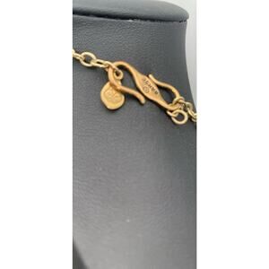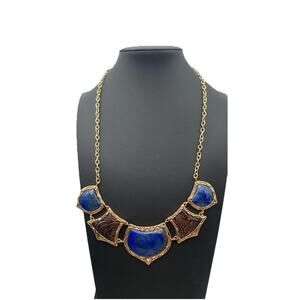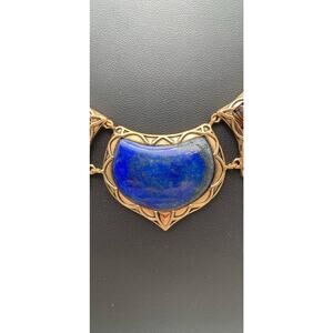 The Barse Lapis Lazuli & Tooled Leather Necklace in an Etruscan style features a shield-shaped pendant adorned with lapis lazuli stones and yellow bronze accents. The necklace is up to 19" in length and has a C-hook closure. The bohemian and Etruscan-themed piece is signed by Barse and showcases a unique bib style design, making it a standout accessory. Made with natural gemstones and leather material, this necklace exudes a multicolor and eclectic charm, perfect for those who appreciate artisanal pieces with a vintage touch.